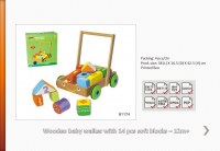 Trotteur en bois de la marque Parkfield. 14 blocs en mousse inclus. 1400€ pour le lot (136 pièces). Localisation : Markt 48, 1780 Wemmel, Personne à contacter : Stéphane Labye, +32 4 76 92 13 75