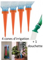 5 pcs Irrigation adaptable sur bouteille Le kit qui vous permet de recycler vos bouteilles d'eau en un ingénieux système d'irrigation. 4 cones d'arrosage automatique 1 douchette matière plastique (PP) taille : cones 12cm x dia 3.2cm douchette 4 cm x diam 3.2 cm packaging : blister...