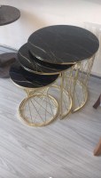 La plus grande table basse : hauteur 58 cm, diamètre miroir 52 cm. Table basse moyenne : hauteur 54 cm, diamètre miroir 44,5 cm. Plus petite table basse : hauteur 50 cm, diamètre miroir 36,5 cm. C'est un ensemble de 3 tables gigognes en métal. Les pieds du produit sont recouverts de GoldNickel...