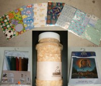 • + de 600 Papiers cadeaux • Canevas • environ 90 Sachets de sable décoration (violet, blanc, vert, kaki , transparent, bleu, jaune, orange... ) de différentes tailles • 12 boites de 72 Fleurs en verre • 50 taine de gravier déco, rose • Divers: Panières en rotin, suspension poche tissu...