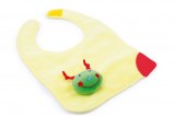 Ces bavoirs sont très doux avec fermeture à scratch pour protège les vêtements pendant les repas ! La tête de chenille au visage souriant contient une petite crécelle et un coin en plastique à picots offrira une occupation aux petits gourmands impatients. Dimensions 25 x 21 x 2...