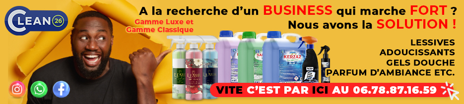 CLEAN 26 Nos produits sont de très bonne qualités, présents dans beaucoup de secteurs (départements) en France et Belgique depuis plusieurs années. Enormes gamme de produits (lessives, adoucissants, nettoyants sols luxe, gels douches luxe, parfum d'ambiance, dégraissants... ) Gamme luxe et classique, plus d'une centaine de réferences validé par nos clients ! Nos produits sont aux normes européennes, avec un suivi en laboratoire, fiches sécurités disponible, étiquetages ... Soyez...