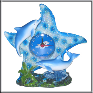 Réveil en résine en forme d'étoile de mer + 2 dauphins en relief - paillettes décoratives- présenté dans une boite décorée