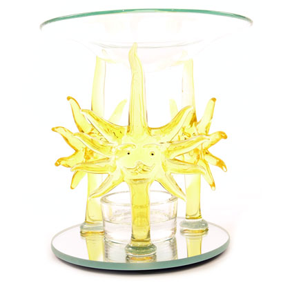 Chaque brûleur à huile Soleil est composé d'une coupelle en verre qui est supportée par trois lumineux soleils personnifiés.