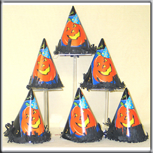Chapeaux pointus en cartons tête de citrouille + franges noires tout autour - 6 pièces dans un sachet transparent