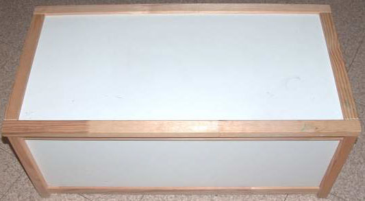 Coffre composé de composants principaux: bois massif et le panneau: Panneau de fibres de bois, Feuille décor, Peinture acrylique. Dimensions: Longueur: 70 cm, Profondeur: 36 cm, Hauteur: 29 cm. A monter soi-meme. Il peut servir de banc.