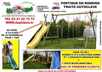 ENSEMBLE POUR ENFANTS PORTIQUE EN RONDINS TRAITE AUTOCLAVE GRANDE HAUTEUR DES PIEDS(3.00m) 2 BALANCOIRES 1 CORDE 1 TOBOGGAN 3.00m