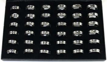 Vds bagues en acier inoxydable divers motifs et tailles.Presentoir contenant 36 bagues.Prix de vente en commerce entre 3.50€ et 5.50 la bague.Ideal pour revendeur !!