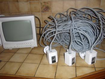 Suite à cessation d'activité cède ensemble matériel vidéo surveillance noir et blanc, idéal pour boutique, comprenant : 3 caméras + un écran de 25 cm + Câbles de connexion (avec très importante rallonge).Connexions possibles pour une 4ème caméra et un enregistreur.