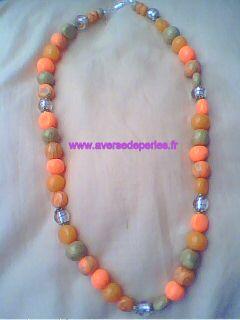 Collier artisanal confectionné en pâte polymère de couleur orange , orange fluo et marron clair et des perles en verre ainsi que des perles tibétain couleur or monté sur fil câblé avec fermoir à vis argenté. "Bijou unique" Longueur totale : 66 cm