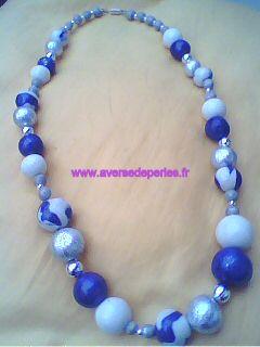 Collier artisanal confectionné en pâte polymère de finition porcelaine blanc de couleurs bleu marine et de gris monté sur fil câblé avec un fermoir à vis argenté. "Bijou unique" Longueur totale : 62 cm