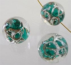 Perle en verre italien-style circulaire avec décoration d'argent et doré de 15mm de couleur vert-bleu. Vendu à l'unité.