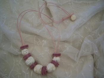 Collier artisanal, composé de perles en pâte végétale naturelle faites à la main et de boutons, montés sur des cordons de coton cirés. Création unique.