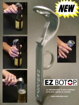 Médaille d' argent au salon de Genève 2010 . Le décapsuleur le plus pratique , le plus rapide et hygienique du monde . Ce nouveau décapsuleur révolutionnaire permet d' un seul geste et d' une seule main de saisir la bouteille , de l' ouvrir en récupérant la capsule, de verser le contenu , de déposer la bouteille et de se débarrasser de la capsule à l' endroit et au moment voulu .De plus ,il est très hygiénique en effet à aucun moment l' appareil ou la main n' entrent en contact avec l' embouchure de la bouteille . L' accessoire indispensable pour les hopitaux, crèches, les bars , les restaurants , les discothèques, etc ... Prononcez " izi botop " : easy bottle opener : décapsuleur facile Vendu en boite de 108 pièce . La cadeau ideal pour la fête des pères ! En direct de chez le fabricant prix d' achatt à la pièce 3 euros , minimum 50 pièces , par 100 pièces : 8 gratuits . Prix de vente dans les magasins en Belgique entre 10 et 20 euros