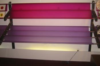 SUPERBE PRESENTOIR POLYVALENT POUR COMMERCE LINEAIRE DE 8 METRES DE LONG (4 SECTIONS DE 2 METRES) HAUTEUR 165 CM / PROFONDEUR 80 CM TRES BEAU DESIGN Matériaux : Tubes en inox (48 mètres) / Plexiglass violine et fuschia/ Fixations IPN (acier) En excellent état DEMANDE 3000 EUROS