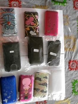lot de coques et housses comprenant 200 housses de protection semi cuir noir et 600 pieces de coques diverses et variéés (strass, drapeau,siliconés.........).le prix du lot est 2400e.