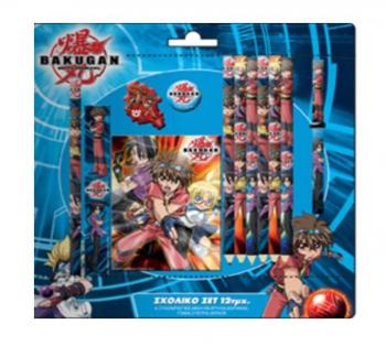 Set de 12 pièces de Papeterie Bakugan qui contient : 6 crayons de couleurs, 1 crayon, 1 stylo, 1 règle, 1 gomme, 1 taille crayon et 1 bloc note
