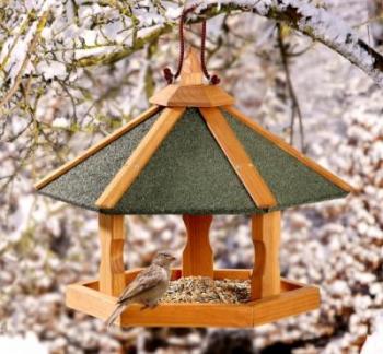 Maison-mangeoire pour oiseaux en bois de pin traité contre la pluie, avec un grand toit recouvert de bardeaux en bitume verte pour protéger la nourriture contre les intempéries.