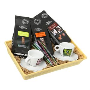 Coffret Cafés du Monde : Moka et Arabica Max Havelar - Moka d'Ethiopie + Arabica du Guatemala + Café saveur Noisette + 2 Tasses décorées et leurs sous tasses - Maison Taillefer.