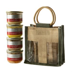 Sac de jute + 4 Verrines origine Landes - France - Landes - Bloc foie canard avec morceaux bocal 175 gr, Paté au piment d'Espelette bocal 175 gr, Rillons de confit canard bocal 175 gr, Paté foie de volaille bocal 175 gr.