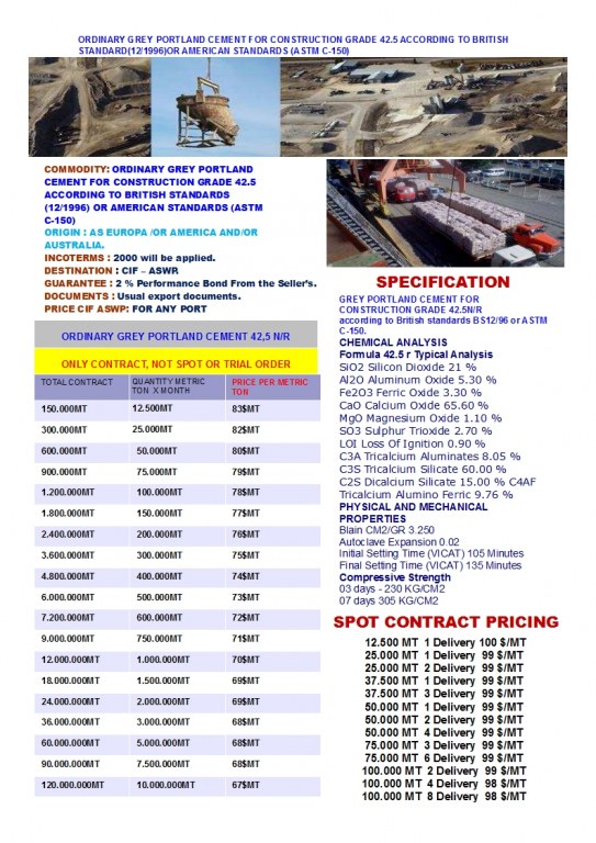 nous vendons du ciment ordinary grey portland cement for construction grade 42.5, according to british standards (12/1996) or american standards (astmc-150) provenant de l'europe et/ou amerique et/ou australie prix contract: (12500mt x 12 $83mt)(25000mt x 12 $82mt)(50000mt x 12 $80mt)(100000mt x 12 $78).... prix spot:(12.500 mt 1 delivery 100 $/mt)(25.000 mt 1 delivery 99 $/mt)(25.000 mt 2 delivery 99 $/mt)