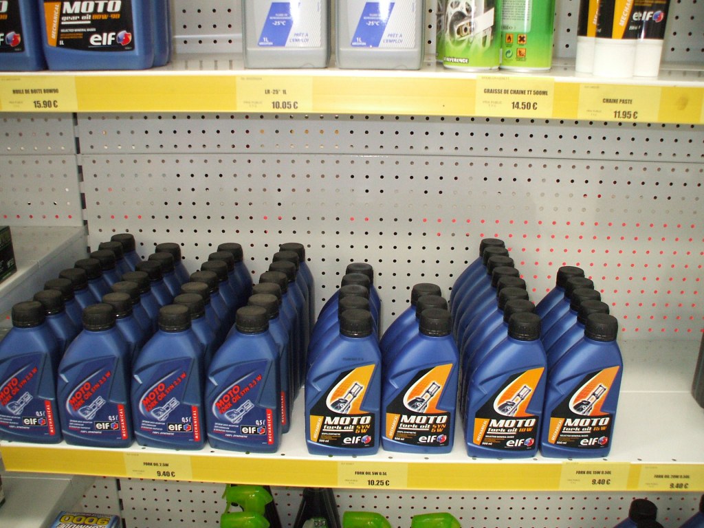 Huiles Elf pour moto, huiles de fourche, boite, filtre à air et liquide de frein. Liste sur demande. Valeur à la vente 920 €.