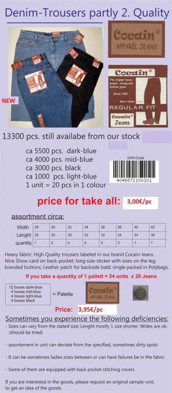 Cette page concerne les Fournisseurs et Grossistes de Lot de pantalons Jeans Denim Rechercher dans la catégorie : Habillement / Mode Rechercher dans la catégorie : pantalons, denim, jeans |