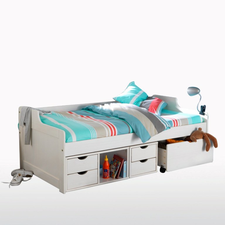 Lit banquette et tiroirs de rangement en pin massif livré prêt à monter avec notice.