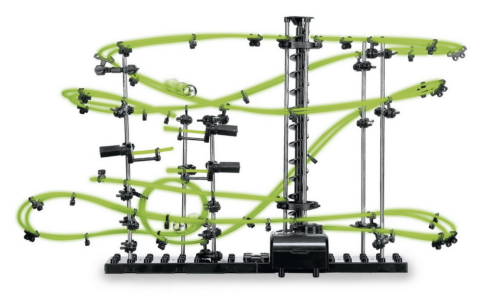 Un circuit Space-Rail à effet fluorescent. Le circuit à concevoir entièrement librement brille la nuit et permet des manœuvres périlleuses avec les billes de métal incluses.