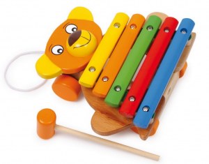 Un ours de bonne humeur accompagne les enfants dans le monde des sons ! Un coup de marteau sur les baguettes posées sur des bandes de feutre, et les sons retentissent - un superbe article en bois de hêtre partiellement verni de couleurs éclatantes qui complète merveilleusement notre gamme d‘instruments de musique.