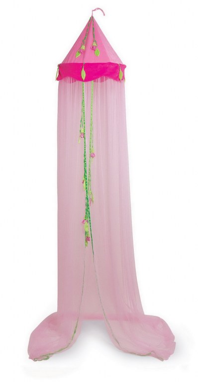 Ce baldaquin est à la fois un ravissant dôme d‘ornement et une bonne protection contre les moustiques. Peluche et filet d‘un rose tendre, garnis de bandes de gaze vert chatoyant et de délicates fleurs et feuilles en tissu, transformant les lits des demoiselles en oasis de rêve!