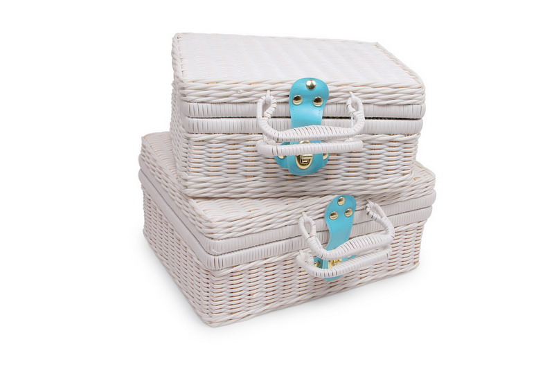 Ces petites valises ont un cadre en rotin revêtu de plastique blanc solide et d‘entretien facile. L‘intérieur est tapissé de tissu à carreaux. Ainsi les petites affaires indispensables au quotidien se laissent-elles transporter chez Mamie et Papi, à l‘école ou en excursion. Des languettes rivetées et une targette permettent de fermer la valise.