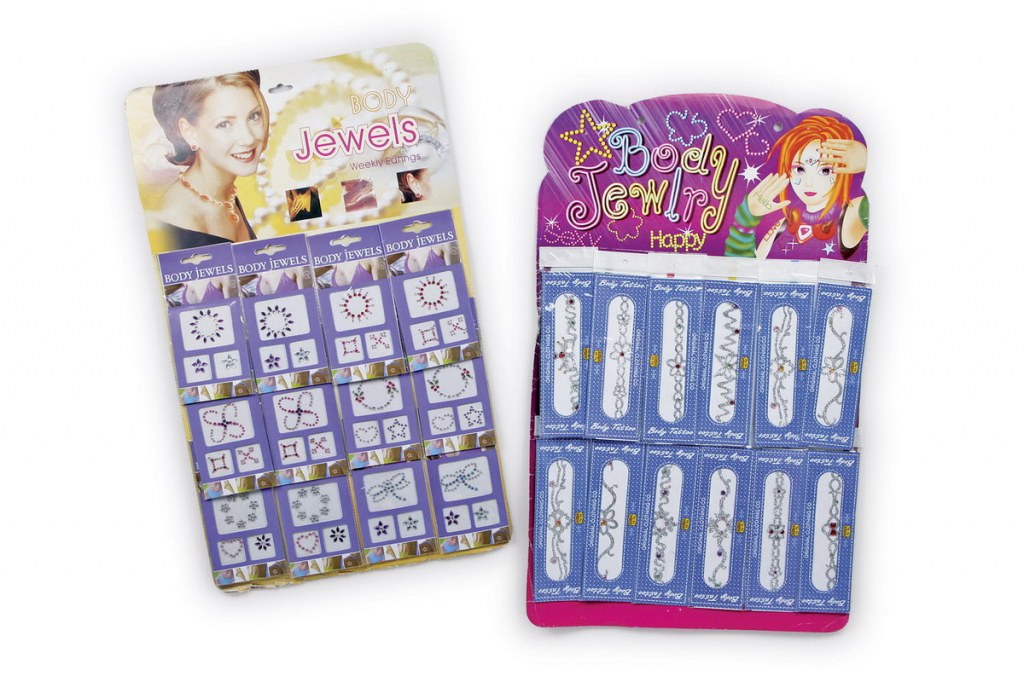 Lot de 2. Ces ornements à coller permettent de décorer temporairement la peau ! 12 motifs tatouage scintillants et 12 motifs perle composés d'éléments acryliques. Fixés sur des panneaux en carton représentatifs, ils peuvent être facilement disposés aux emplacements de vente stratégiques.