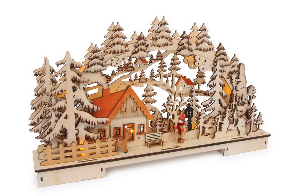 Un magnifique panorama de Noël avec illumination poétique du fond. Un pays de merveilles hivernal pour la fenêtre de Noël ou pour la chambre dans lequel se trouve le sapin de Noël. Nécessite 2 piles AA (non incluses).