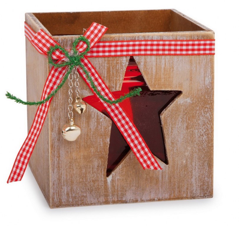 Dans le bac décoratif en bois avec 2 découpes d‘étoiles, un verre rouge (env. 9,5 x 9,5 x 9,8 cm) crée des reflets raffinés de lumière dans la pièce !