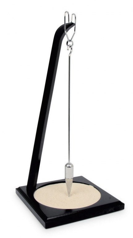 Si l‘on fait doucement osciller le pendule, il trace dans le sable des motifs réguliers et aide à retrouver le calme intérieur et l‘équilibre. L‘association de bois verni noir et de métal brillant en fait un objet très décoratif.