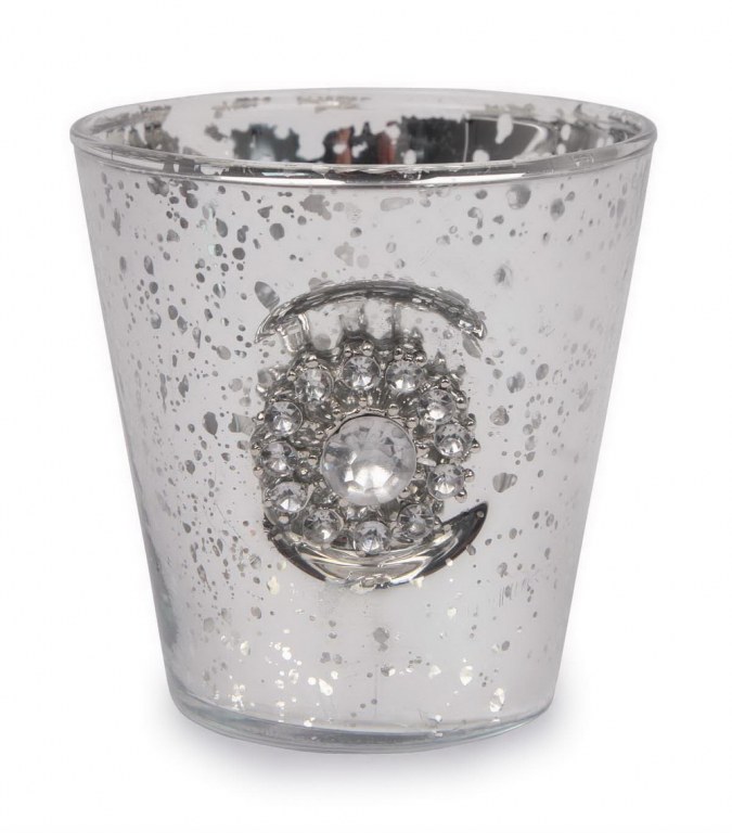 La peinture argentée mouchetée de petites ouvertures à l‘intérieur des verres fait danser des tâches de lumière dans la pièce! Une fleur en diamants d‘acrylique encastrée renforce la chaleur des rayons de la bougie.