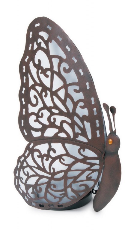 Cette lampe en métal couleur rouille est une merveilleuse décoration sur pied représentant un délicat papillon. Une petite lampe à LED se trouve dans le socle - à la tombée de la nuit, une douce lumière verte rayonne derrière les ailes ! Un film de plastique à retirer recouvre l‘intérieur des ailes.
