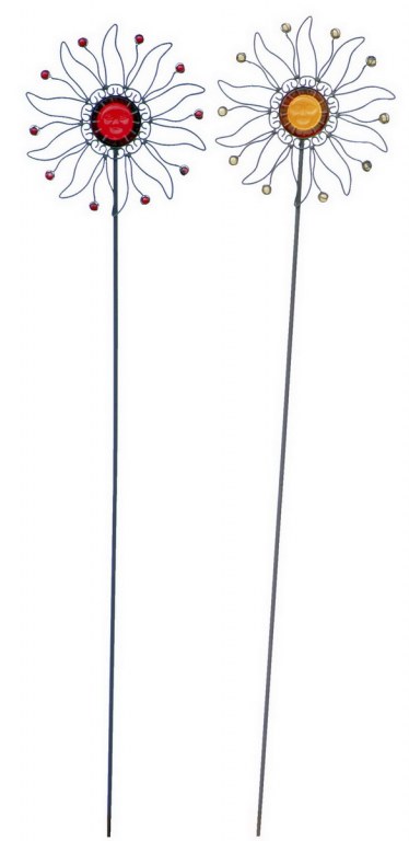 Soleils stylés sur supports en optique martelée. Visages et boules en verre orange ou rouges parachèvent le design !