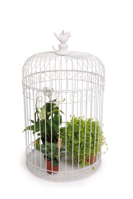Ces 3 volières à accrocher et à poser sont une magnifique décoration en métal verni blanc. Peu importe si on l‘utilise pour des oiseaux chanteurs colorés ou comme support pour des arrangements de plantes, on pourra mettre de bels accents à l‘intérieur, sur la terrasse et le balcon! Coupole orné d‘un oiseau qui s'ouvre pour mettre des plantes de grandes tailles, étrier de fermeture et crochet pour accrocher.