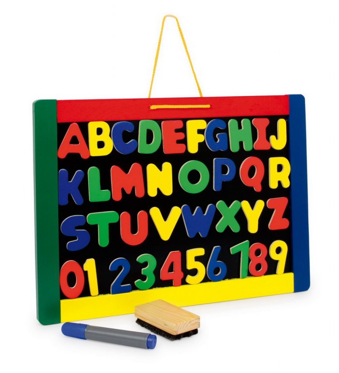 Ce formidable tableau en bois verni de couleurs invite à peindre et écrire! On utilise le coté blanc pour un marker soluble à l‘eau, une éponge avec poignée en bois nettoie si besoin est. Les lettres et chiffres en bois stratifié verni de couleurs sont équipés d‘une feuille magnétique grâce à laquelle ils tiennent bien sur le coté noir.