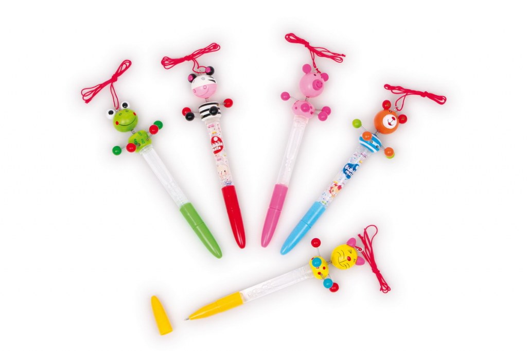 Ces stylos sont ornés d‘amusants bonshommes colorés dont la tête et les membres gigotent au bout de ressorts de métal. Le détail coup de cœur : en soufflant sur la tête, on produit des bulles de savon et le stylo s‘allume de lumières rouges quand on écrit ! Avec long cordon pour porter autour du cou.