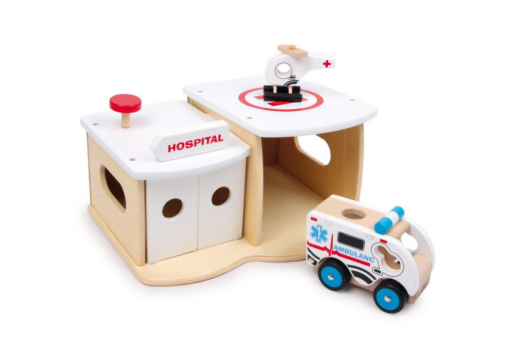 Avec ce superbe hôpital en bois stratifié verni clair et en couleur, des heures de jeu passionnantes sont garanties ! Un garage à porte à 2 battants et un terrain d‘atterrissage sur le toit servent de parking à la voiture et l‘hélicoptère en bois massif partiellement verni.