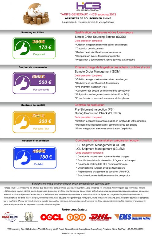 HCB soucinga toujours dédié à fournir des services de sourcing en Chine pour l'ensemble de nos clients enfin de vous aidez à employer les meilleures pratiques de sourcing, réduire à la fois vos dépenses d'achats directs et indirects et ainsi améliorer votre rentabilité et votre efficacité.