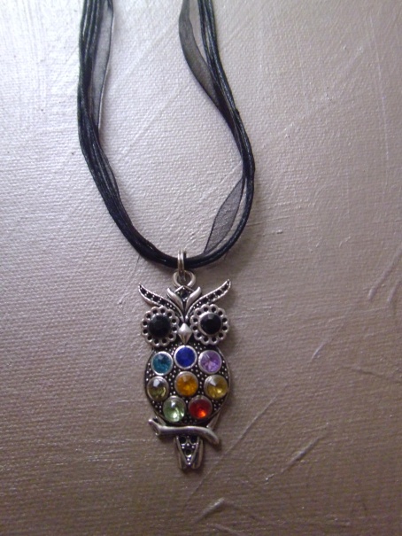 bonjour je vends un lot de 10 colliers hibou avec strass sur collier en organza noir