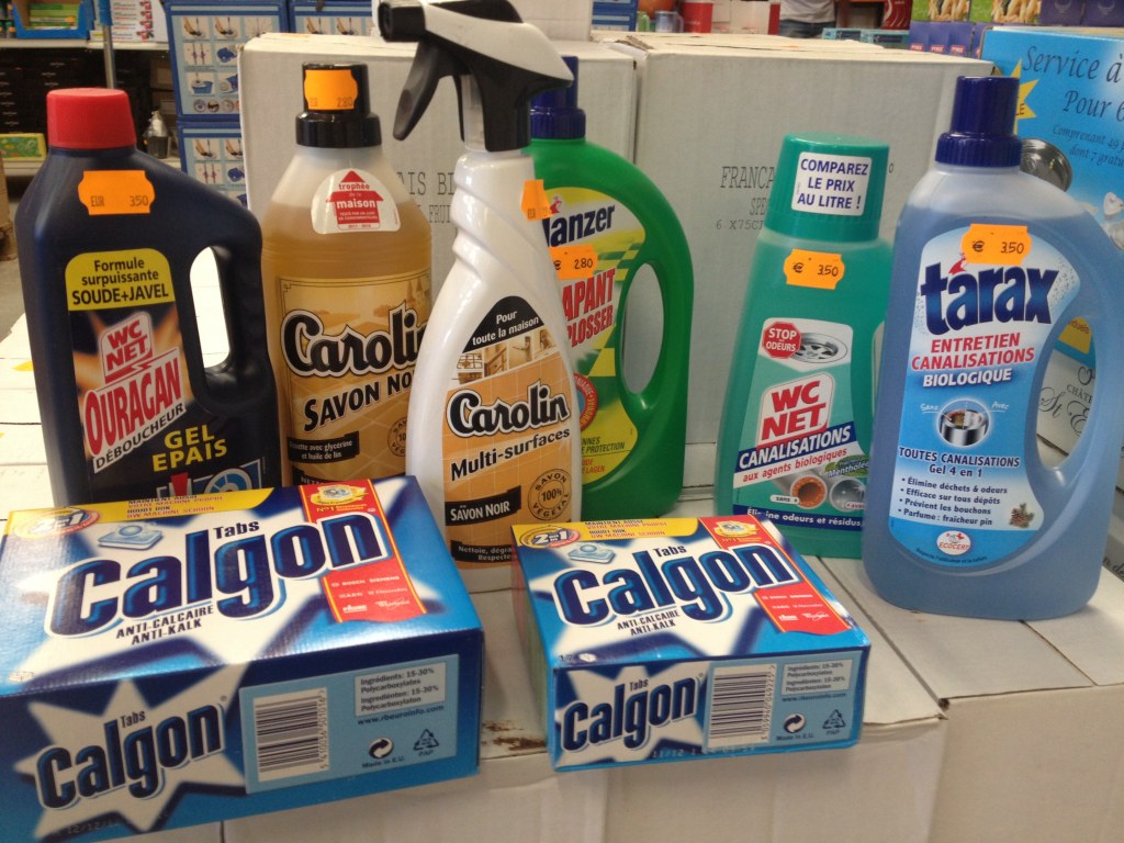 Vd 1 part de produit d'entretien : quantite 894 pieces, valeur vente en solderie 2878,60 ttc . Marque des produits ( carolin ,calgon,wc net ,glanzer ,w5