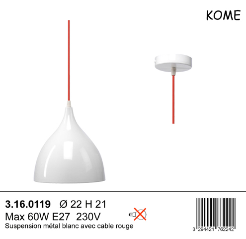 SUSPENSION KOME BLANC H 23CM D 22CM, SUSPENSION METAL (FER) BLANC AVEC CABLE ROUGE. E27 MAX 60W 230V COMPATIBLE ECO 23W