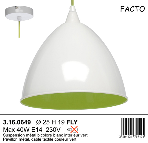 SUSPENSION METAL BICOLORE BLANC INTERIEUR VERT PAVILLON METAL, CABLE TEXTILE COULEUR VERT HAUTEUR TOTALE: 19CM DIAMETRE TOTAL: 25CM .