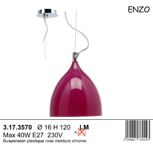 SUSPENSION ENZO ROSE H 120CM D 16CM, SUSPENSION PLASTIQUE AVEC MONTURE CHROME CABLE ACIER PAVILLON METAL. ABAT JOUR POLYPROPYLENE ROSE 16X16X16,2.