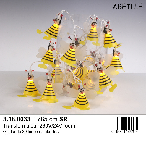 GUIRLANDE LUMINEUSE 20 LUMIERES ABEILLES JAUNE/NOIR EN PVC, LONGUEUR TOTALE 785 CM LONGUEUR LUMIERE 285 CM.TRES BASSE TENSION 12 VOLTS 24 WATTS